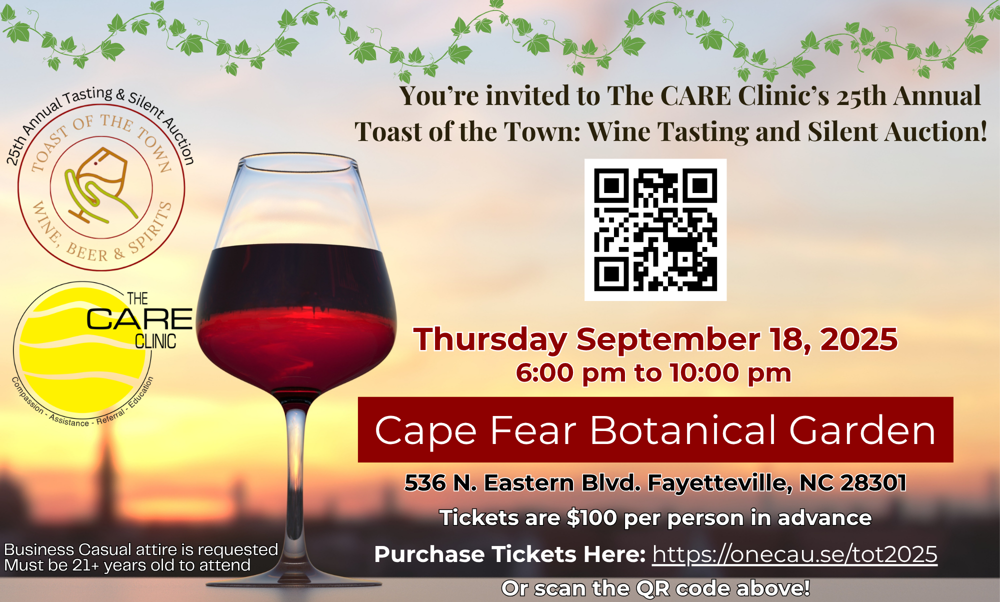 As the crisp fall air begins to settle in and the leaves turn to vibrant hues, it’s the perfect time to plan a night out. Mark your calendar for Thursday, September 18th, 2025! The CARE Clinic is excited to host our 25th Annual “Toast of the Town”—an evening of Wine, Beer, & Spirits Tasting and a Silent Auction. The event will take place from 6:00 -10:00 p.m. at the beautiful Cape Fear Botanical Gardens.