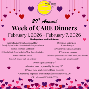 This year’s Week of CARE will take place February 1–7, 2026, and we are truly grateful to partner once again with two incredible local restaurants/caterers: Luigi’s Italian Chophouse & Bar and Dorothy’s Catering 2. Together, we are offering a comforting variety of take-home meals, lovingly prepared and available for pickup during specific time slots throughout the week. Each meal feeds approximately six people and many can be frozen for later. More than just a meal, we hope these moments around the table become time spent enjoying good food, warm conversation, and the company of those who matter most.